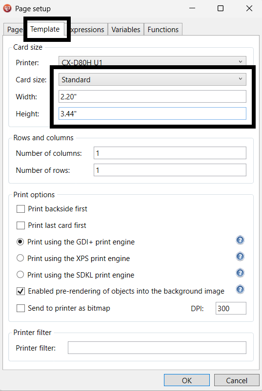 3. Under Template Tab, Change Card size from Custom to Standard.